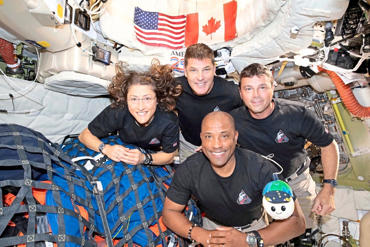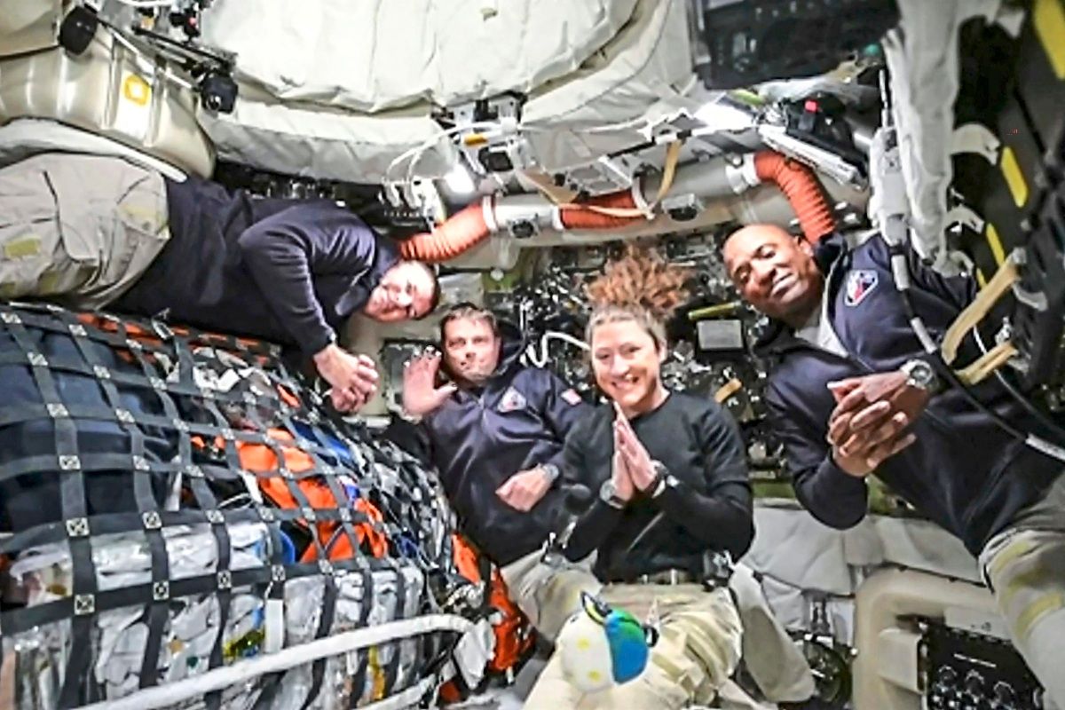Die Artemis-II-Besatzung vor der Orion-Kapsel (von links): Missionsspezialist Jeremy Hansen, Pilot Victor Glover, Kommandant Reid Wiseman und Missionsspezialistin Christina Hammock Koch.