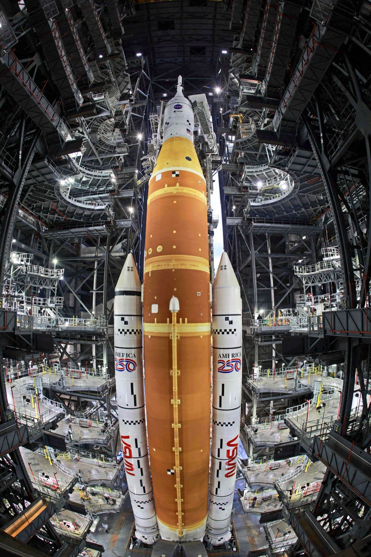 Das Vehikel für die Rückkehr von Menschen zum Mond hat seinen letzten Weg auf der Erde hinter sich gebracht. Die vollständig montierte Space-Launch-System-Rakete (SLS) rollte am Samstag aus dem Vehicle Assembly Building der Nasa in Cape Canaveral (Florida, USA). Nach fast zwölf Stunden gemächlicher Fahrt erreichte die riesige Mondrakete die Startrampe 39B des Kennedy Space Centers – ab da geht es für sie nur mehr nach oben.