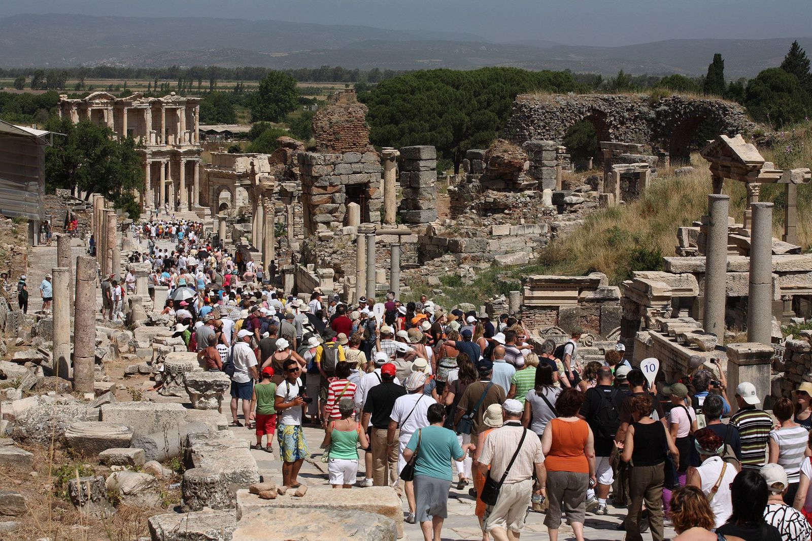Diese Blütezeit schlug sich in der Architektur nieder. Zu den berühmtesten Monumenten gehört die Celsus-Bibliothek. Ihre Fassade wurde in den 1970er Jahren wiedererrichtet. Seitdem ist sie eine Attraktion für viele Touristinnen und Touristen. Wer in sozialen Netzwerken via Hashtag nach Ephesos sucht, wird auf unzählige Selfies vor der Bibliotheksfassade stoßen. Jährlich besuchen rund zwei Millionen Menschen aus aller Welt die antike Ruinenstadt in der Türkei.